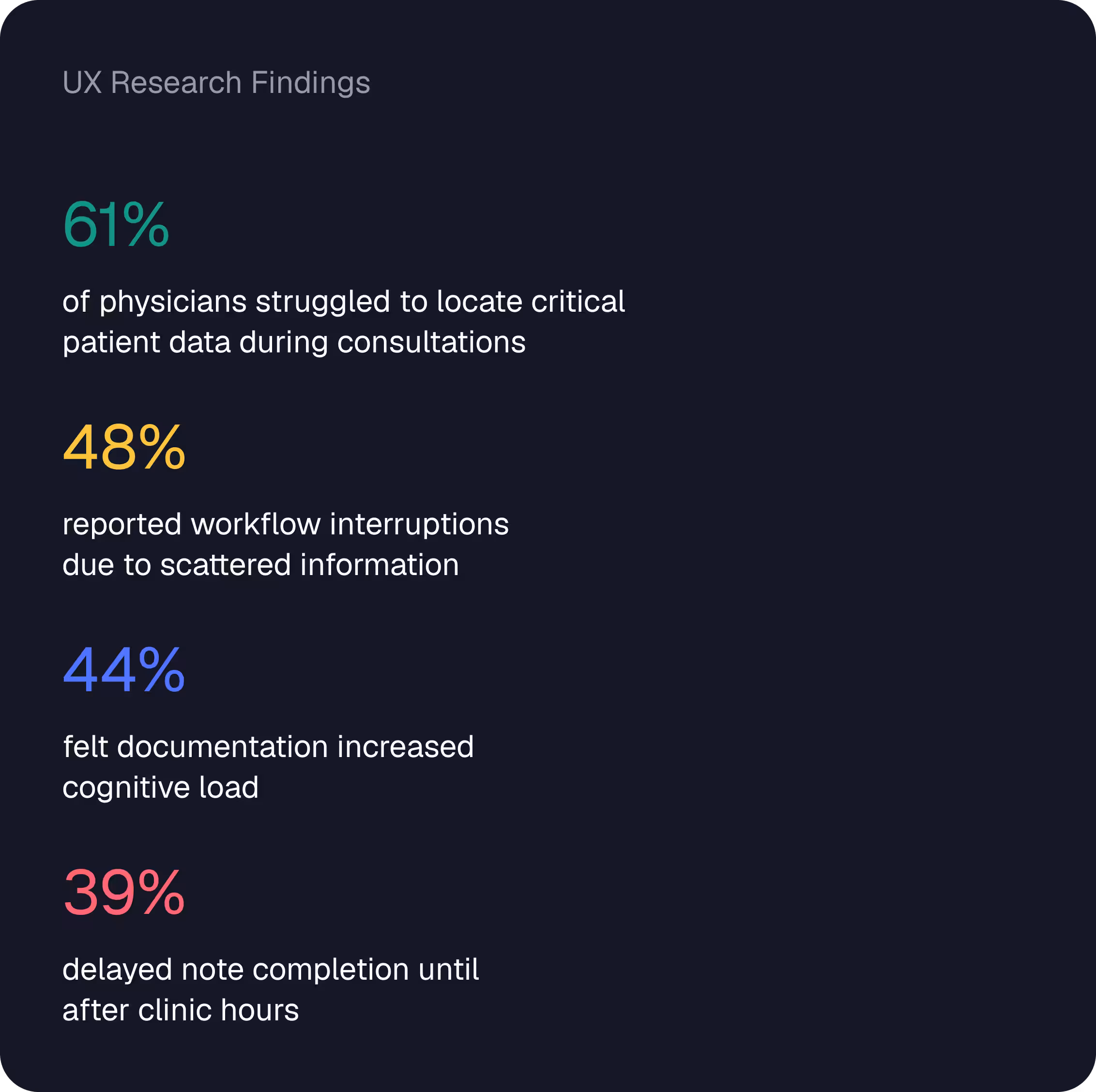 Our discovery phase focused on understanding real clinical workflows, practitioner pain points, and compliance-driven constraints. We analyzed how doctors access patient data, where delays occur, and which information is most critical during consultations. Insights from this research shaped the product’s information architecture, ensuring that every screen prioritized speed, clarity, and usability in high-pressure medical environments.